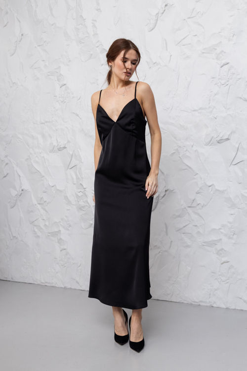 - Сукня виготовлена з якісного сатину. - Красиво лягає по фігурі, створюючи витончений силует. - Тонкі бретелі та V-подібне декольте додають образу легкості та жіночності. - Застібається ззаду на потаємну блискавку, що забезпечує зручність і бездоганну посадку. - На моделі розмір S