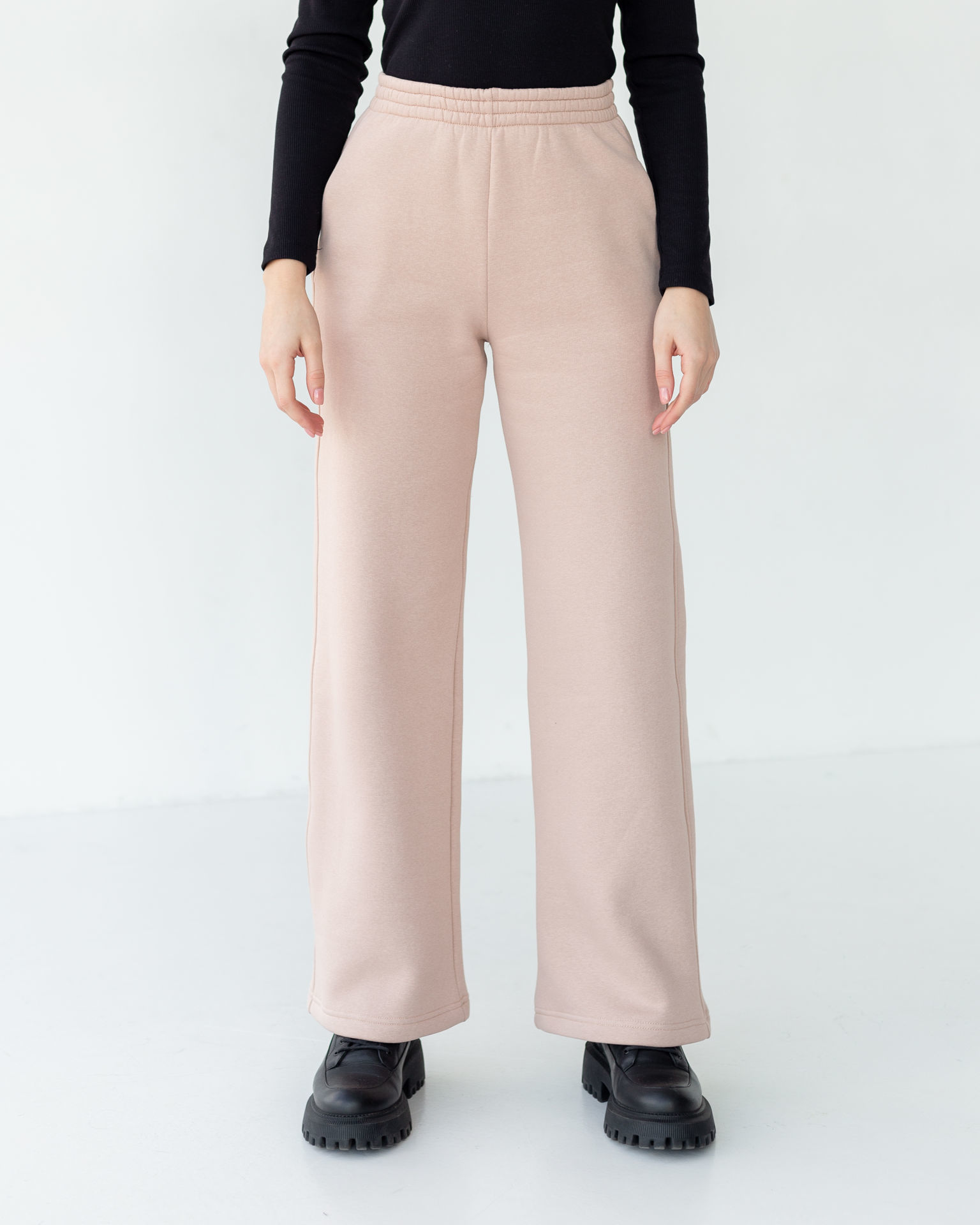 - У моделі зручний вільний прямий крій , пояс на резинці. - Зверху у бічному шві є зручні прорізні кишені. Дана модель бездоганно поєднується з худі, світшотами, водолазками, футболками і навіть топами з нашого асортименту. - Тканина: троьохнитка начіс - на моделі розмір S