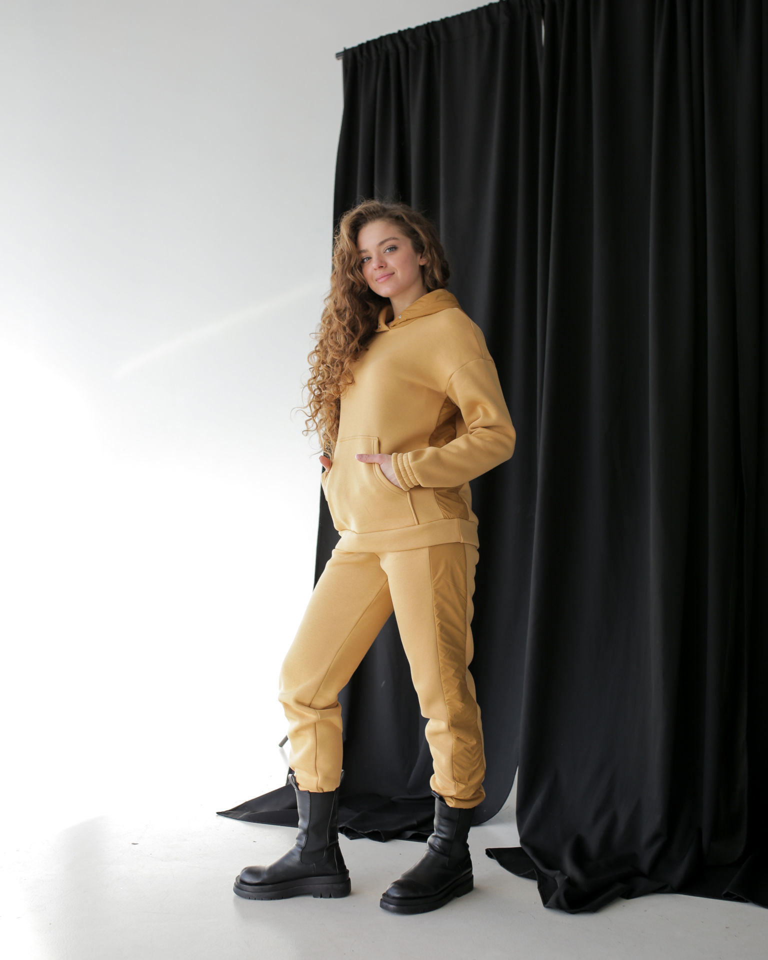 Матеріал: байка на флісі (85% котон) У штанах краю низу прямі, а в поясі вшита широка резинка, з зовнішнього боку вставки з плащової тканини. У oversize худі капюшон застібається на кнопку, виконаний з плащової тканини і доповнений підкладкою з основної тканини, так само з боків теж є вставки з плащової тканини. Пройми опущені, прямий низ та довгі рукави закінчуються трикотажними манжетами.
