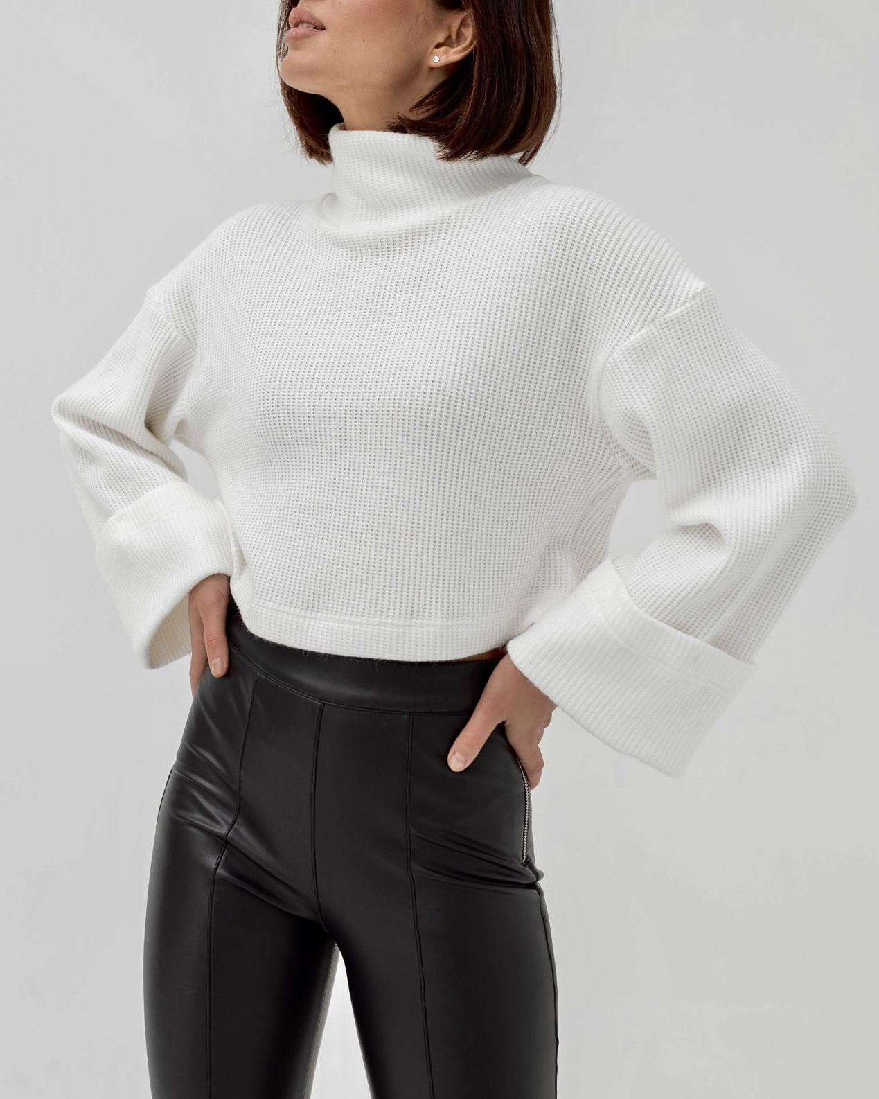 Кругла горловина доповнена високим коміром, який складається вдвічі.