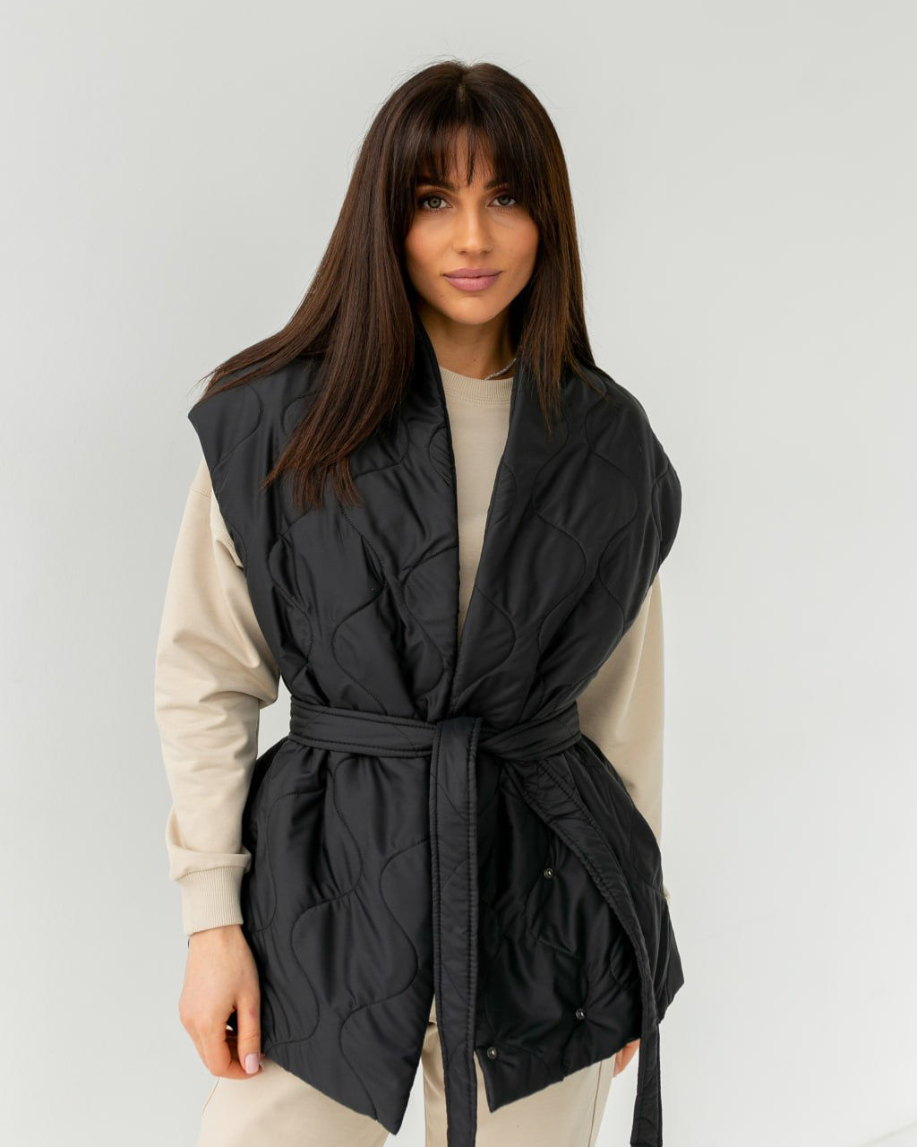 - модель вільного крою - тканина: щільна плащівка + має додаткове утеплення - застібається блискавкою та додаково має кнопки - внизу жилет можна для зручності затягнути та має дві бічні кишені - на моделях розмір S