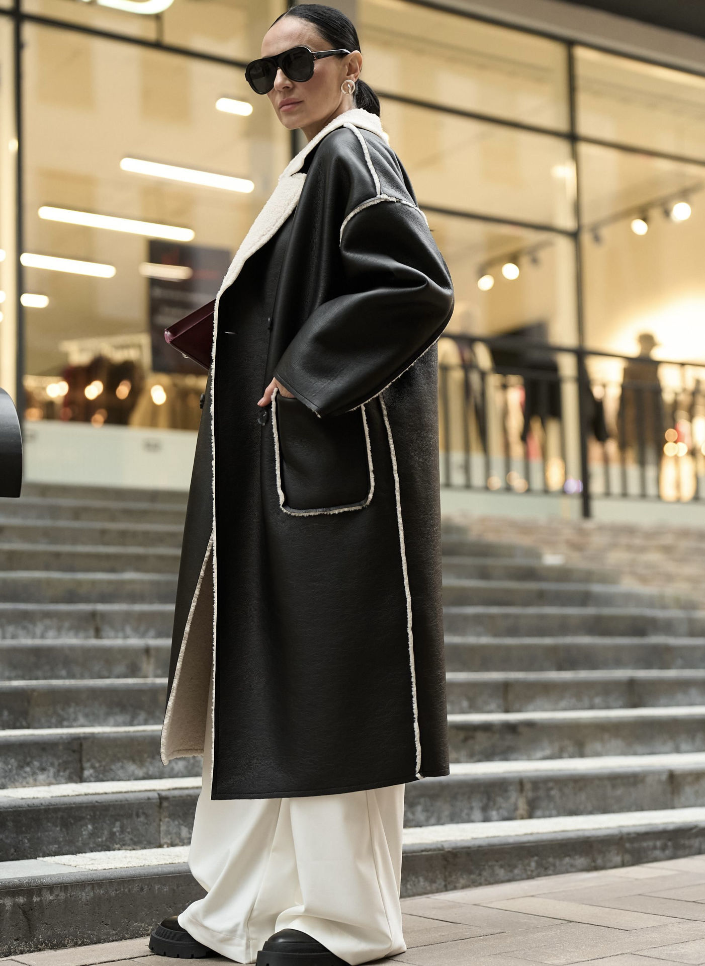 Жіноча дублянка подовжена -чорна з молочним хутром