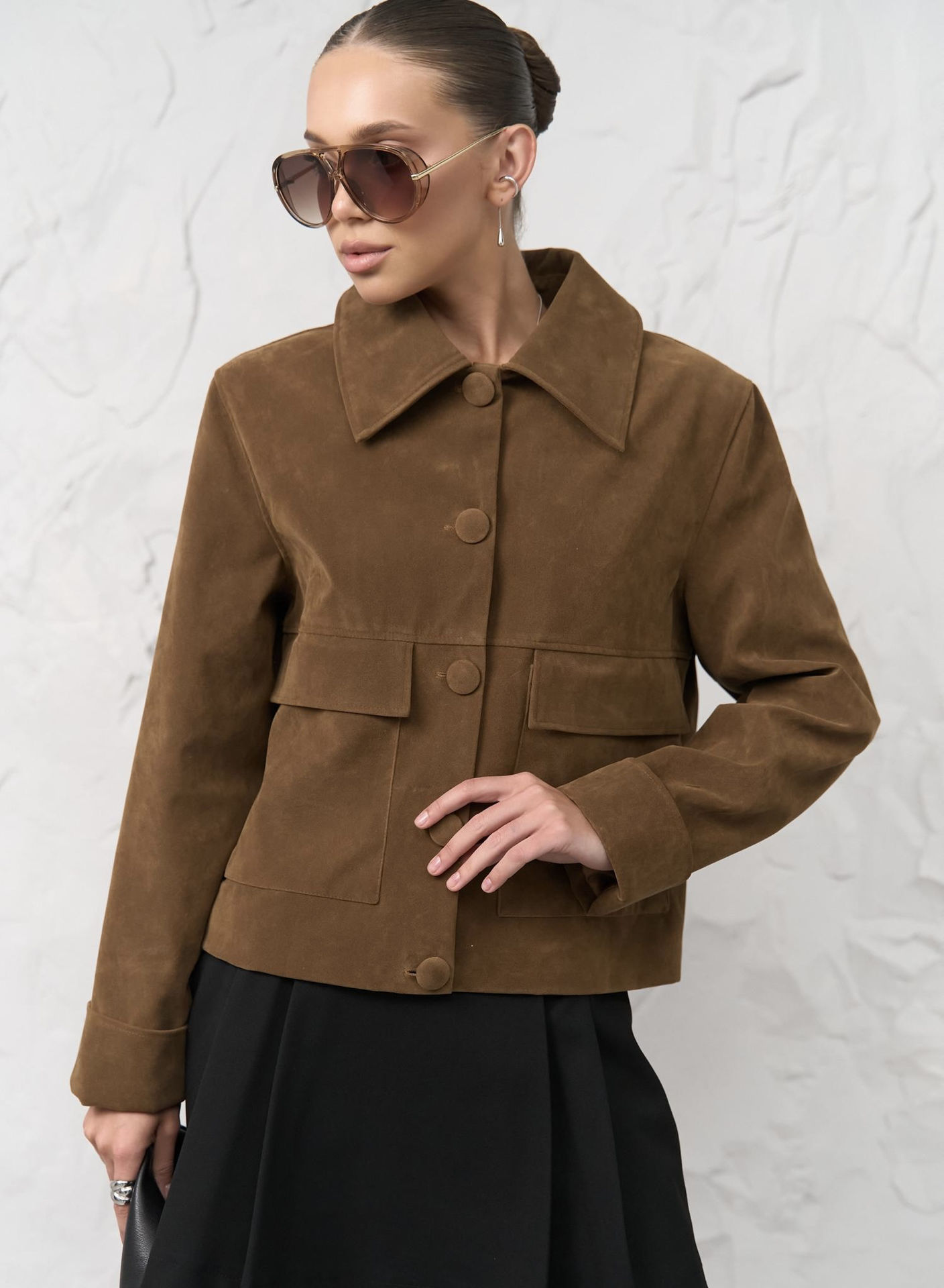 — Куртка з обʼємним коміром та накладними кишенями. — Матеріал: нубук — Розміри: XS, S, M, L — На моделі розмір S