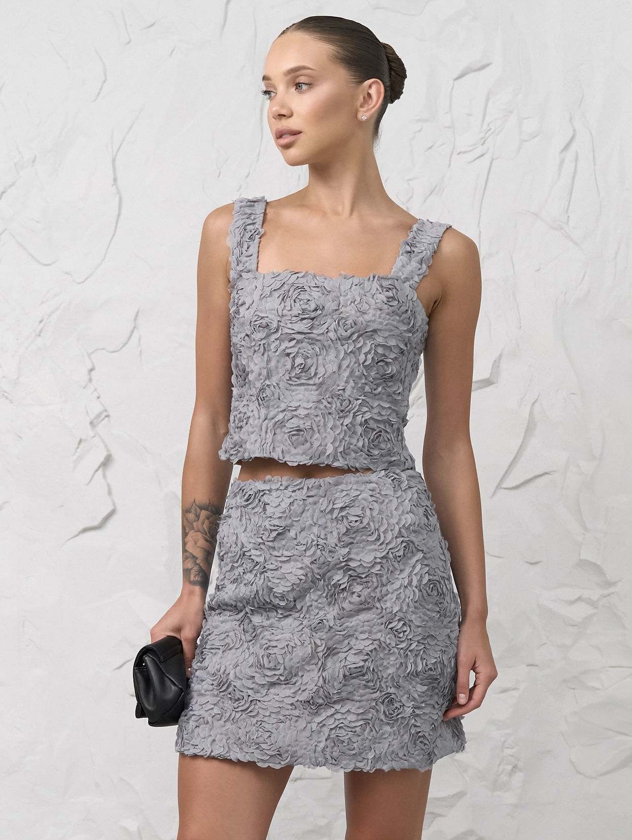 - Топ та спідниця повністю оздоблені об'ємною вишивкою квітів, що створює неповторний візуальний ефект. - Тканина:сітка аплікація на трикотажній підкладці (матеріал не парить та комфортний до тіла) - Елементи костюма можна носити як разом, так і окремо, поєднуючи з іншими речами вашого гардероба. - Розміри: XS, S, M