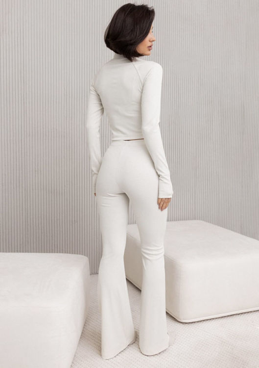 Верх: - приталений вкорочений топ з подовженими рукавами - комірець-стійка - в рукавах розріз для великого пальця - якісна фурнітура Низ: - Штани мають високу посадку - пояс на резинці - модель кльош - тканина рубчик - на моделях розмір S