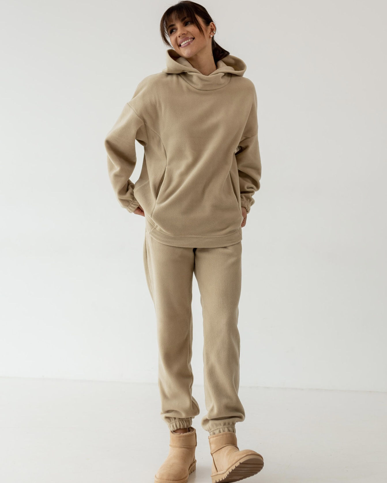 - Тканина тепла, м'яка та приємна до тіла - Модель гарної якості та не кашлатиться матеріал - Штани джогери - Кофтинка худі подовжена з зручним капюшоном та двома бічними кишенями